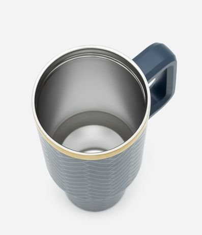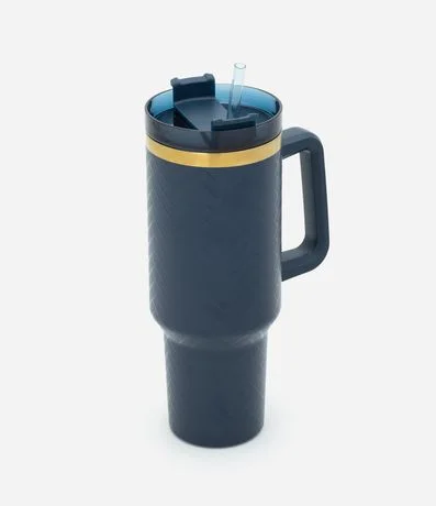 Copo térmico com superfície texturizada em padrão discreto, alça lateral robusta e faixa metálica superior. Tampa giratória e canudo reutilizável. Capacidade de 1,2L, ideal para manter bebidas na temperatura por mais tempo.