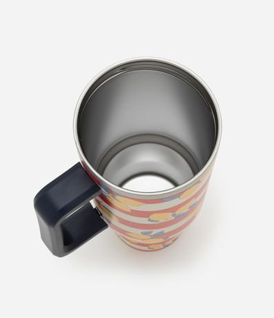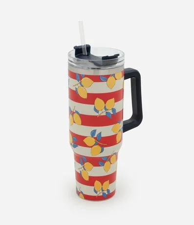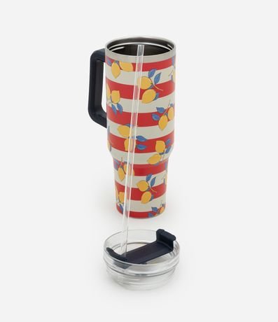 Ref: Copo térmico com tampa de rosca, canudo reutilizável e estampa listrada contrastante com frutinha.