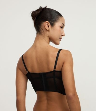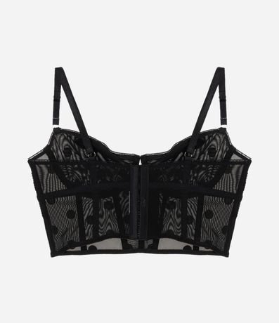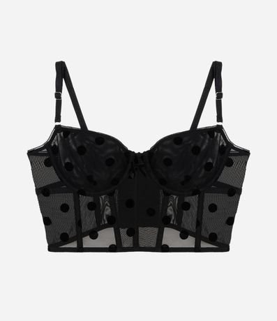 Corset feminino confeccionado em tule. Possui um design alongado, barbatanas verticais que estruturam a peça, taças com aro, sem bojo, alças médias e reguláveis, fechamento na parte superior por meio de colchetes e estampa poa.