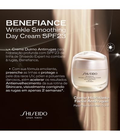 O Benefiance Wrinkle Smoothing Day Cream SPF23 entrega hidratação 24 horas devido a sua formulação emoliente e preenche as linhas para uma aparência de pele lisa, vibrante e mais jovem. É um creme antirrugas com SPF23 que protege a pele contra raios UV, pólen e poluentes danosos, além de torna-la mais responsiva aos benefícios antienvelhecimento da sua rotina de skincare para revelar uma aparência jovem e radiante.