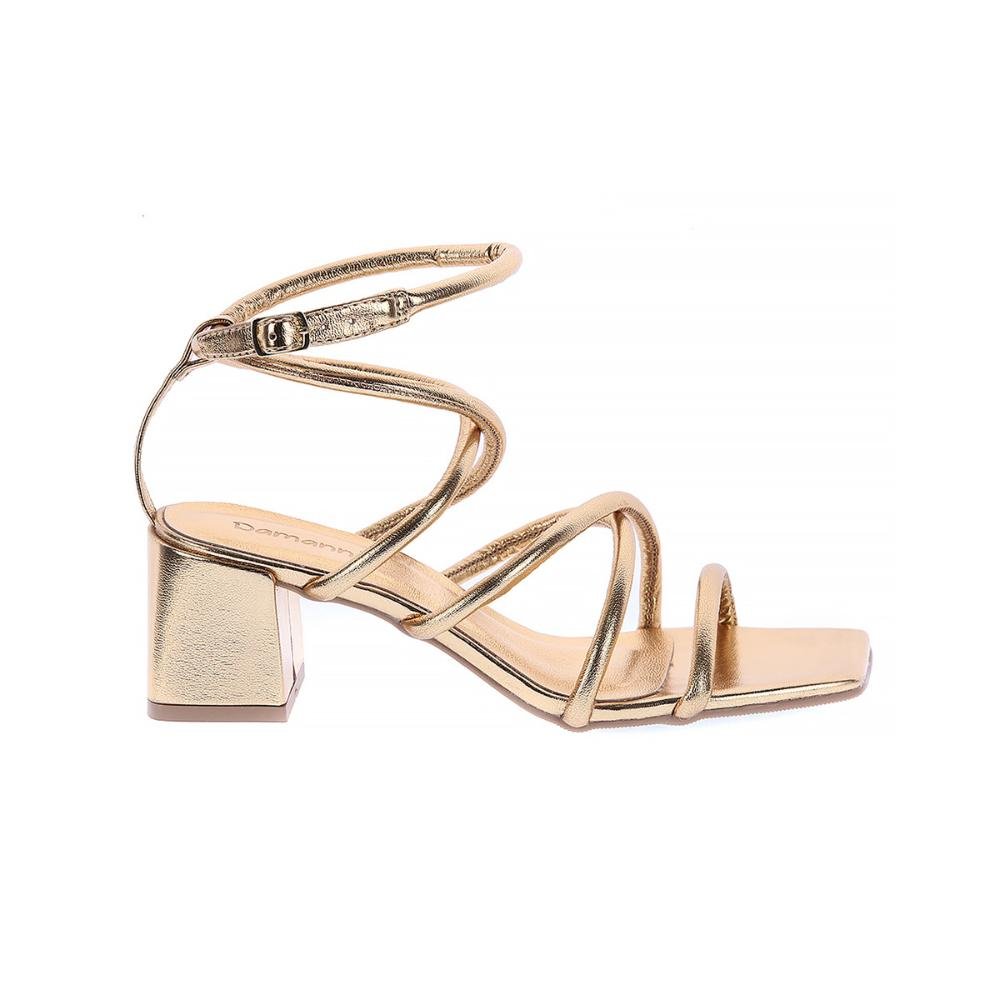 Daiana - Sandália Dourada de Tiras com Salto Bloco e Amarração no Tornozelo