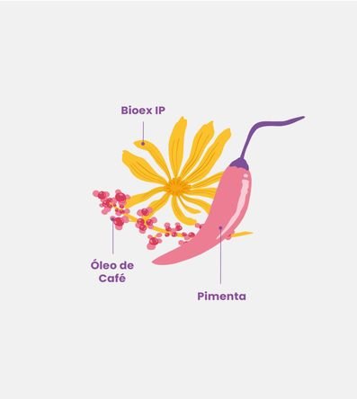Ativos principais: BIOEX-IP; ÓLEO DE CAFÉ; EXTRATO DE PIMENTA; Composição: Aqua, Cetearyl Alcohol, Cyclopentasiloxane, Ethylhexyl Stearate, Propylene Glycol, Caprylic/Capric Triglyceride, Glyceryl Stearate, Coffea Arabica Seed Oil, Ceteareth-20, Parfum, Mica, Phenoxyethanol, Dimethicone, CI 77891, Panthenol, Glycerin, Methyl Nicotinate, Alcohol, Centella Asiatica Leaf Extract, Fucus Vesiculosus Extract, Equisetum Arvense Extract, Arnica Montana Flower Extract, Aesculus Hippocastanum Seed Extract, Ilex Paraguariensis Leaf Extract, Hedera Helix Extract, Capsicum Annuum Fruit Extract, Zingiber Officinale Root Extract, Disodium EDTA, Arnica Montana Flower Oil, BHT, Cyclohexasiloxane, Coumarin, Cyclotetrasiloxane, Potassium Sorbate, Sodium Benzoate, Tetrasodium EDTA, Cinnamyl Alcohol, CI77861, Linalool, DMDM Hydantoin, lodopropynyl Butylcarbamate