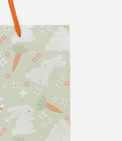Embalagem de presente confeccionado em papel e papelão Fsc mais sustentável. Possui tamanho médio com estampa de coelhos e cenouras, estrutura reforçada, alça chata em fita e acabamento resistente, ideal para presentes temáticos e embalagens sazonais com bom espaço interno.