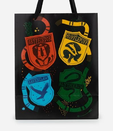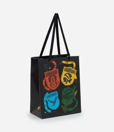 Ref: Sacola pequena de presente com alças duplas e estampa dos Brasões do Harry Potter.