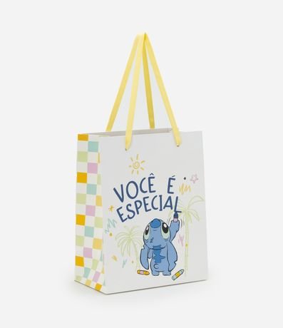 Embalagem para presente pequena com alça dupla fina, estampa quadriculada lateral e Stitch com a frase Você é Especial!