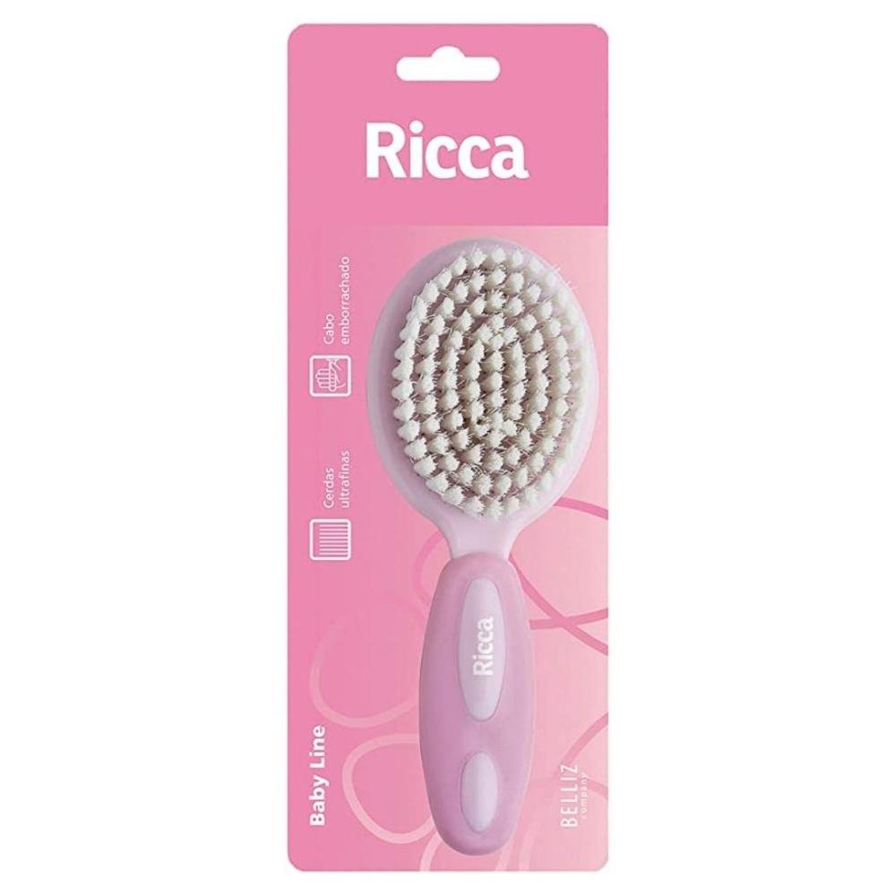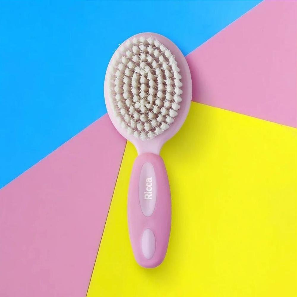 Escova com cerdas ultrafinas em nylon para o delicado couro cabeludo do bebê, cabo emborrachado para maior segurança no manuseio.