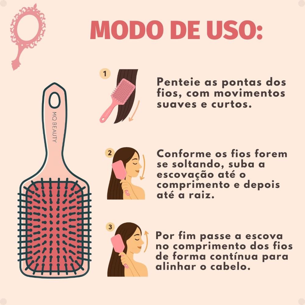 Utilize a Escova Raquete Grande MQ Beauty Macarron Collection Rosa nos cabelos secos ou úmidos, começando pelas pontas e subindo gradualmente até a raiz para desembaraçar suavemente. Para alinhar e finalizar, escove os fios no sentido desejado.