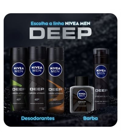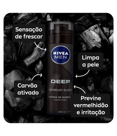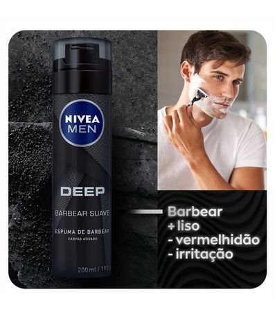O que é? NIVEA MEN Espuma de Barbear Deep é um produto de cuidado masculino que proporciona uma limpeza profunda e eficaz à pele durante o barbear. Para que serve?Com sua fórmula inovadora e a presença de carvão ativado em sua composição, esse produto oferece benefícios únicos, além disso, é Antibacteriano e possui uma fragrância suave que deixa uma sensação de frescor por muito mais tempo.Dermatologicamente testado,? NIVEA MEN Espuma de Barbear Deep promove um barbear suave e é ideal para homens que desejam uma experiência de barbear completa, de qualidade e uma sensação prolongada de pele limpa.Benefícios e diferenciais:- Carvão ativado atua contra as bactérias- Sensação de frescor- Limpa a pele- Previne vermelhidão e irritação- Amacia o pelo da barba