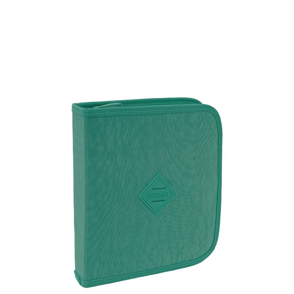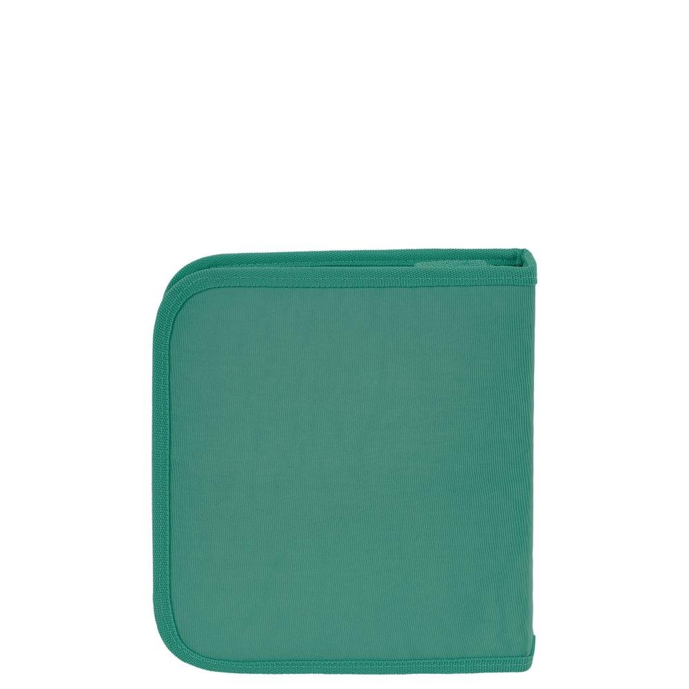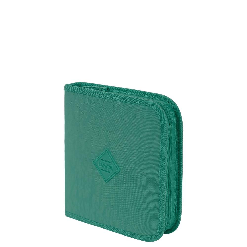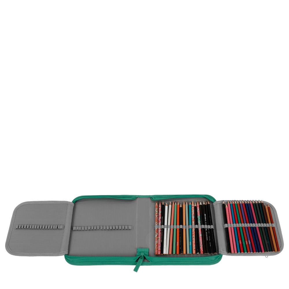 Ref: Estojo Artístico Crinkle Verde - Jade produzido em nylon, possui fechamento com zíper, formato especial, organizador interno, bolso interno em tela, elástico prendedor para 72 lápis, divisória interna e bolso interno com zíper.