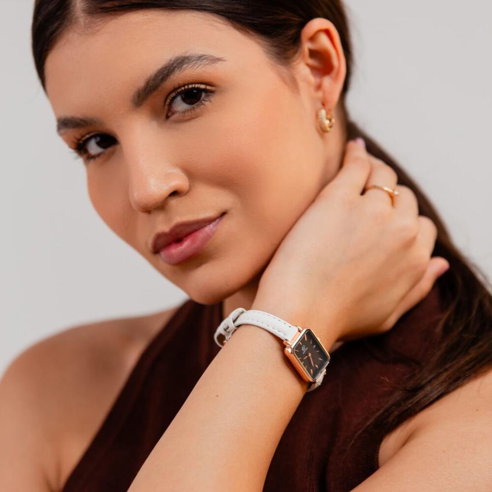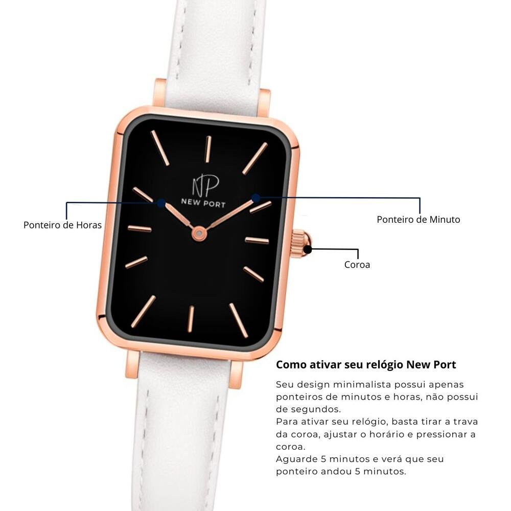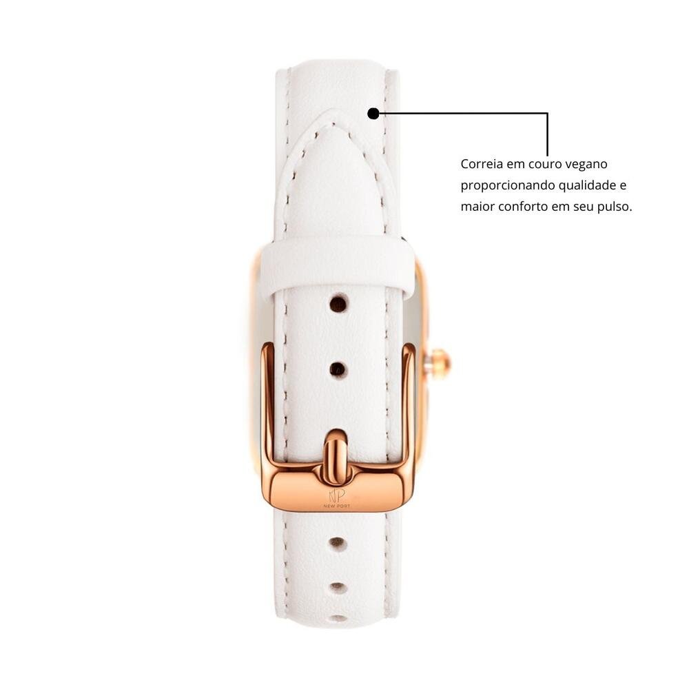 Ref: O Kit apresenta o Relógio Feminino New Port Quadrado Casual Piermont Rosé, com sua pulseira de couro vegano branca, possui um elegante diâmetro de 20x26mm. Sua caixa em metal rosé abriga um mostrador preto, protegido por vidro de mineral resistente, garantindo durabilidade e estilo. Complementando-o, o clássico bracelete rosé em aço inoxidável foi meticulosamente desenhado para espelhar a cativante beleza dos nossos relógios casuais minimalistas.