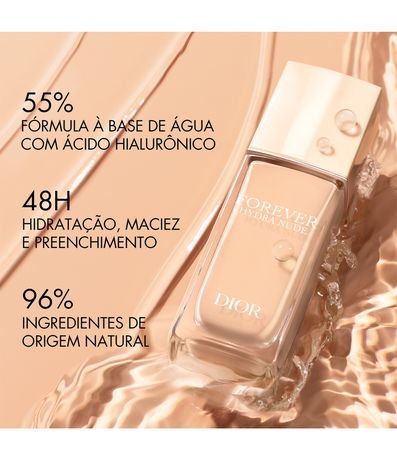 Formulada com 96% de ingredientes de origem natural1, entre os quais pigmentos minerais em perfeita afinidade com a pele, a base Dior Forever Hydra Nude realça naturalmente a pele em um só gesto. Infundida com ácido hialurônico, revela uma textura que proporciona uma sensação de frescor imediato e oferece 48 horas2 de hidratação. A pele é visivelmente preenchida e parece plena de hidratação. 1 Valor calculado com base na norma ISO 16128-1 e ISO 16128-2. Percentagem de água incluída. 2 Teste instrumental realizado em 30 pessoas.