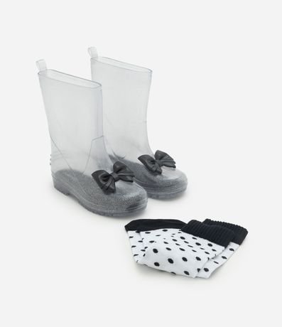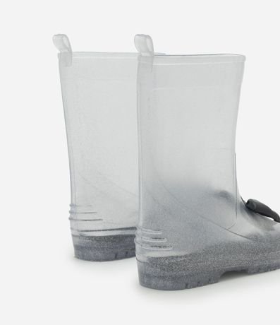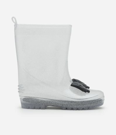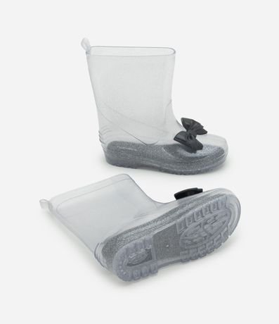 Galocha infantil confeccionada em PVC transparente com glitter, oferecendo proteção para dias chuvosos e visual divertido. Possui laço aplicado no peito do pé, puxador traseiro e solado tratorado. Acompanha meia canelada com poás, garantindo conforto e estilo ao conjunto.