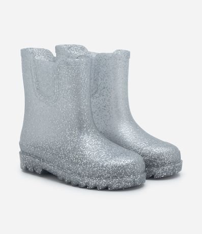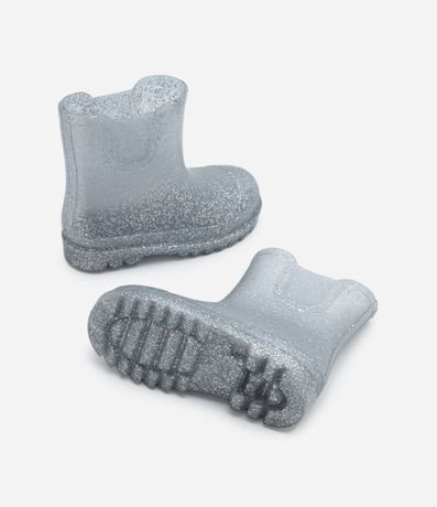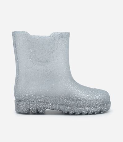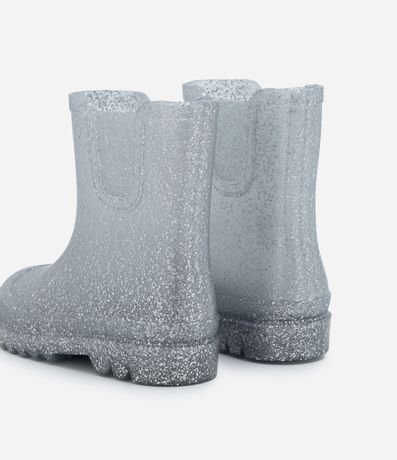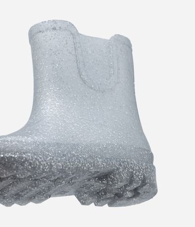Ref: Galocha infantil transparente, com cano médio, aplicação de glitter e palmilha lilás.