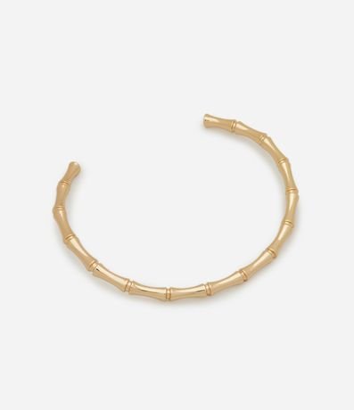 Gargantilha em metal, de modelo rígido, aberta e com formato que lembra bambus.