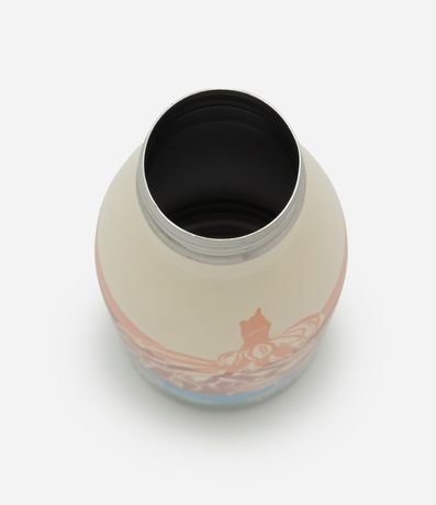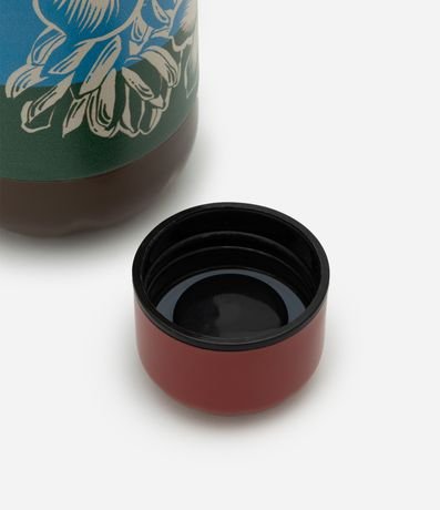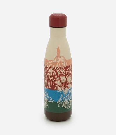 Ref: Garrafa metálica feminina com estampa floral, corpo cilíndrico com base reforçada, tampa rosqueável e bocal estreito.