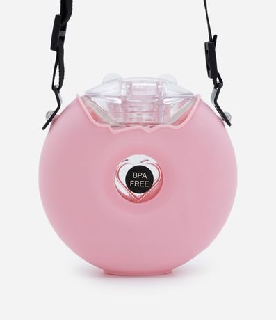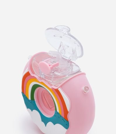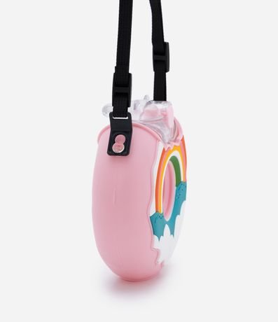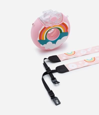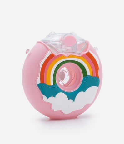 Ref: Garrafa plástica redonda com formato de arco-iris, abertura no topo por botão e alça larga removível.