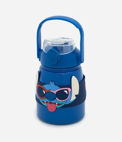 Ref: Garrafa térmica com tampa de botão, alça de mão, canudo e acessório de silicone com o rostinho do querido Stitch.