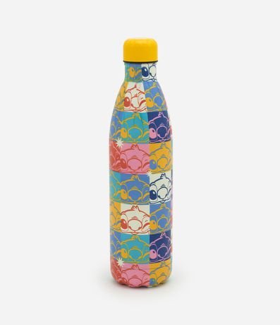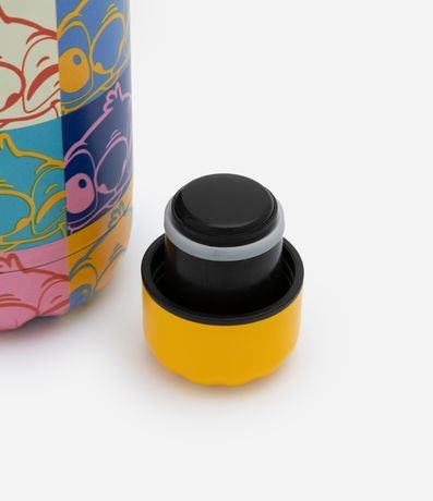 Ref: Garrafa térmica confeccionada em metal com tampa de rosca vedada e estampa de bloco de cores rotativa do personagem Stitch.