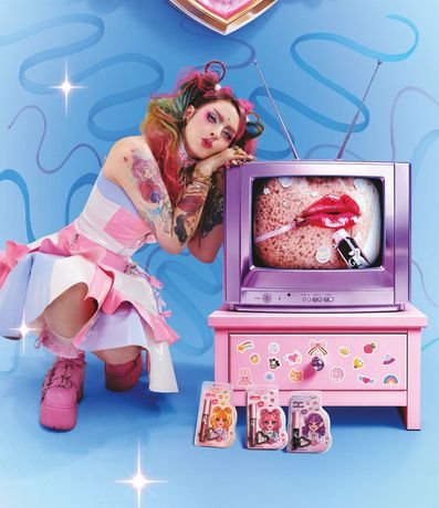 Ref: O Tattoo Blush & Gloss chegou em uma edição super especial, feita para você personalizar e levar sempre com você! Tem anel de silicone e um mosquetão em formato de coração super fofo que transforma ele em chaveiro e você pode levar com você pra onde quiser. E não para por aí: essa edição vem com uma cartela colecionável de adesivos desenhados com muito carinho por mim. Três modelos diferentes, um para cada gloss! Pra completar, a boneca é um adesivo gigante, pra você colar onde sua criatividade mandar!