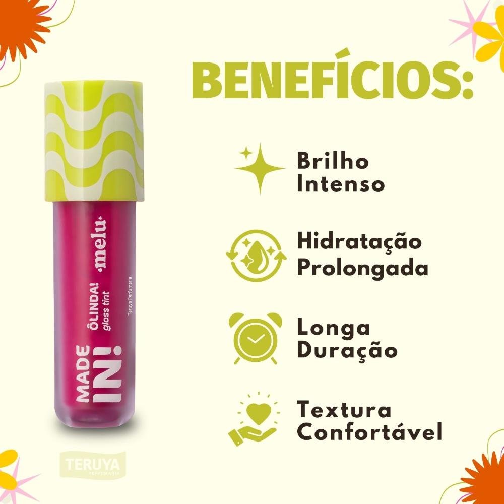 Descubra o Gloss Tint Melu Mede In! Ôlinda: Pitelzinho RRl6402-3 da MELU, a escolha perfeita para quem busca realçar a beleza dos lábios com um toque de cor e cuidado. Este Gloss Tint inovador une o charme do brilho espelhado a uma fórmula de cuidados intensivos, proporcionando um visual deslumbrante e lábios saudáveis.
