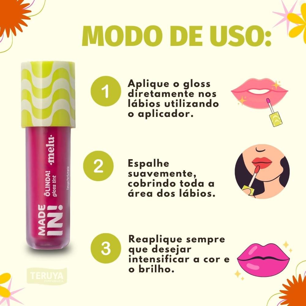 Aplique o Gloss Tint Melu Mede In! Ôlinda: Pitelzinho diretamente nos lábios com o auxílio do aplicador.