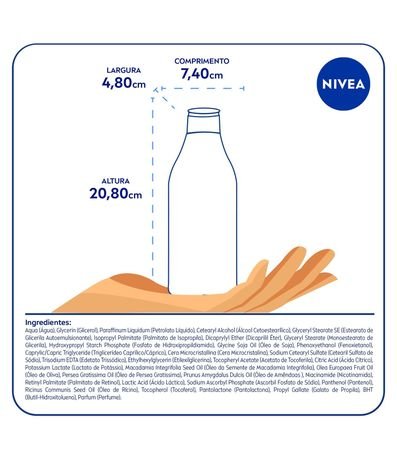 Enriquecida com óleos de abacate, oliva, soja, macadâmia e amêndoas, além de vitaminas E, B3 e Pro Vit B5, esta loção proporciona um brilho natural e deixa a pele radiante e saudável, além de ajudar na redução de estrias