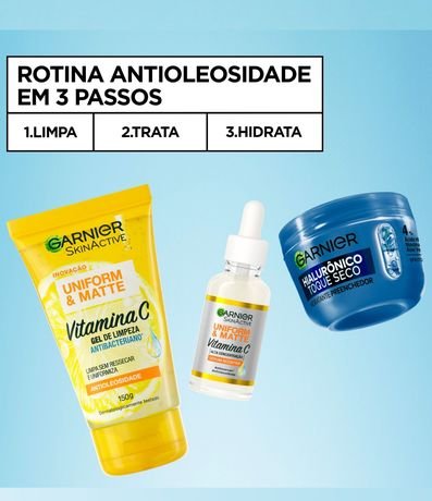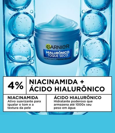 Garnier Hidratante Hialurônico Toque Seco é um hidratante facial numa textura revolucionária para peles mistas e oleosas. Hidrata e reduz a oleosidade com 8h de toque seco. Com Ácido Hialurônico, Niacinamida e Aloe vera, o novo Hidratante Toque Seco Preenchedor uniformiza a pele, controla a oleosidade, tem efeito preenchedor, além de hidratar sem pesar. Com resultados comprovados pelas consumidoras, onde 91% sentiram uma sensação refrescante ao aplicar, 91% sentiram a aparência da pele ficar melhor, 91% notaram uma pele mais uniforme e 82% sentiram redução visivelmente da aparência de poros, o Hidratante Toque Seco Hialurônico possui uma textura que não é gel, não é creme, não pesa, só experimentando para sentir! Pode ser usado diariamente na sua rotina de skincare e em todos os tipos de pele, em especial as peles mistas e oleosas.
