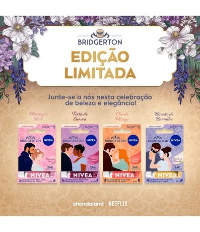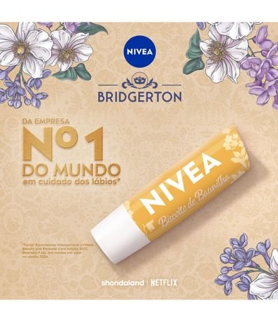 Ref: NIVEA Hidratante Labial Biscoito de Baunilha Edição Limitada Bridgerton é um cuidado labial inspirado na sofisticação e no encanto da série Bridgerton. Com um delicioso aroma de caramelo doce, proporciona hidratação intensa por até 24 horas, deixando os lábios macios, suaves e com aparência naturalmente saudável.
