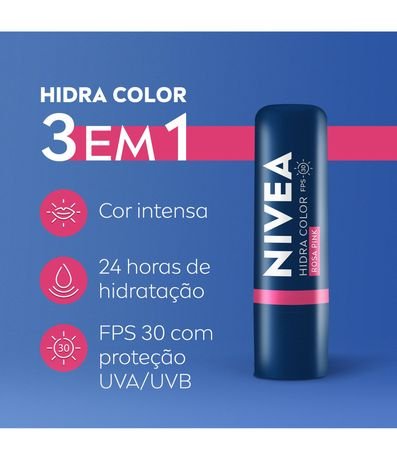 NIVEA Hidra Color Rosa Pink vai muito além da beleza, promovendo hidratação de longa duração e protegendo os lábios do ressecamento e contra raios UVA/UVB com FPS 30. Possui uma cremosidade que desliza de maneira fácil e uniforme, com acabamento pink intenso. Ajuda a proteger contra a perda de colágeno nos lábios.*
