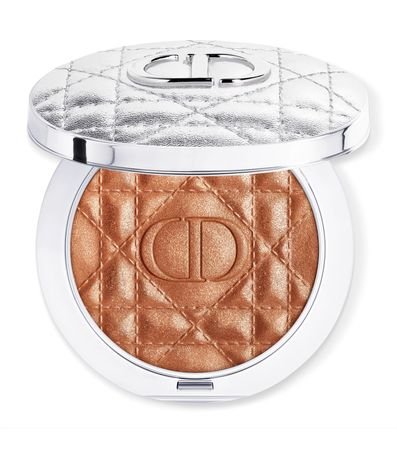 Pó iluminador encaixado em um estojo couture prateado com as iniciais ""CD"" de Christian Dior.