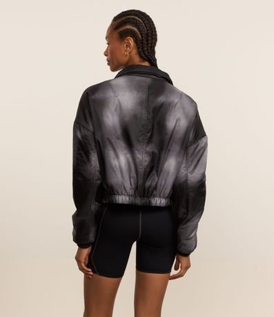 Ref: Jaqueta balonê gola alta com abertura frontal de ziper, estampa manchada, elástico na barra e lettering move.