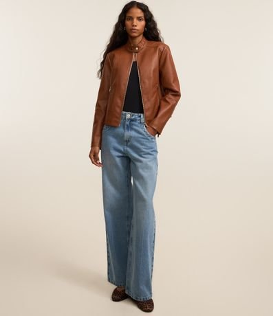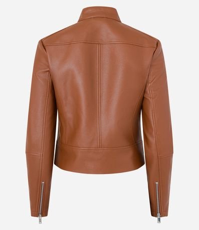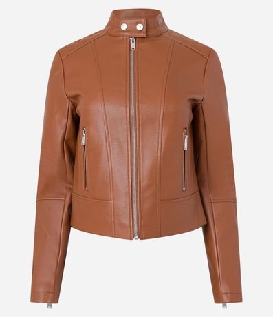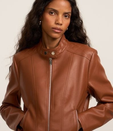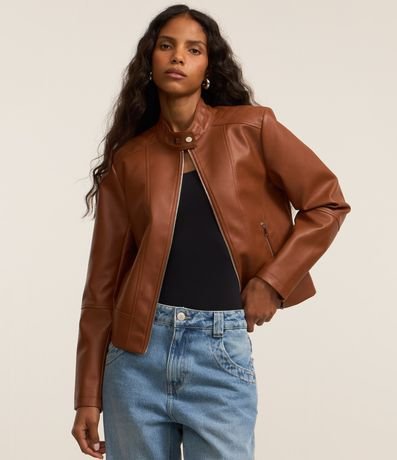 Jaqueta feminina básica, confeccionada em material sintético, com golinha alta, botões na gola e fechamento frontal por ziper.