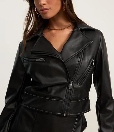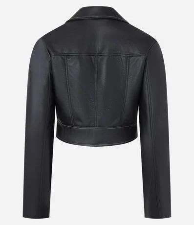 Jaqueta Biker Cropped em PU com Zíper e Pespontos