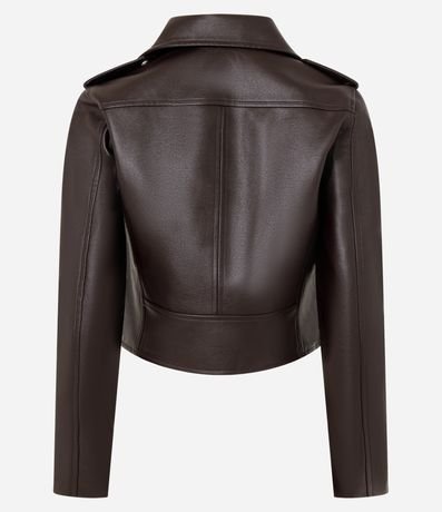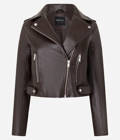 Ref: Jaqueta biker confeccionada em material sintético, pu, com bolsos de zíper e tiras com botões nas laterais.