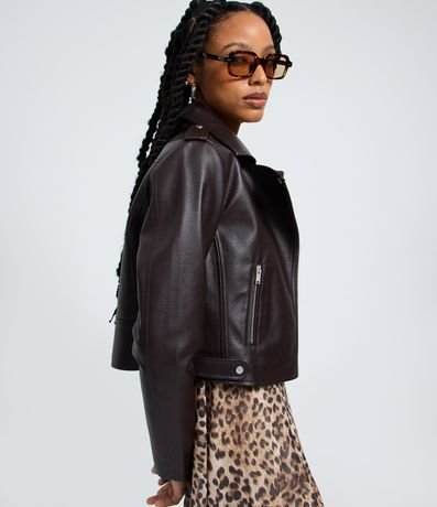 Ref: Jaqueta biker confeccionada em material sintético, pu, com bolsos de zíper e tiras com botões nas laterais.