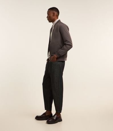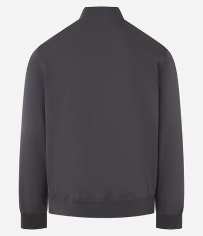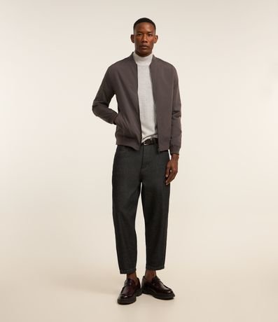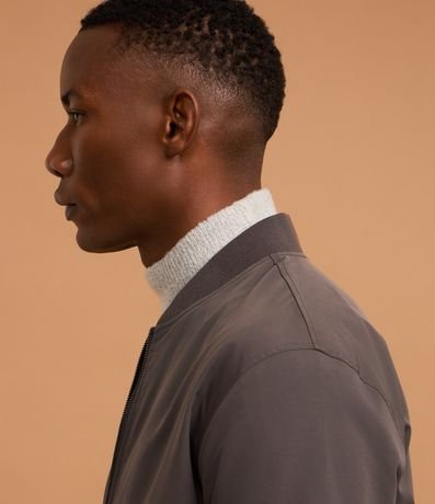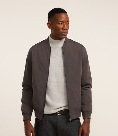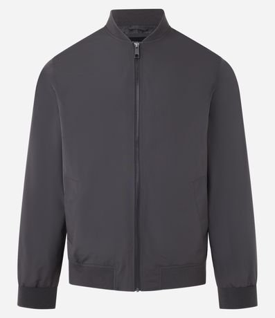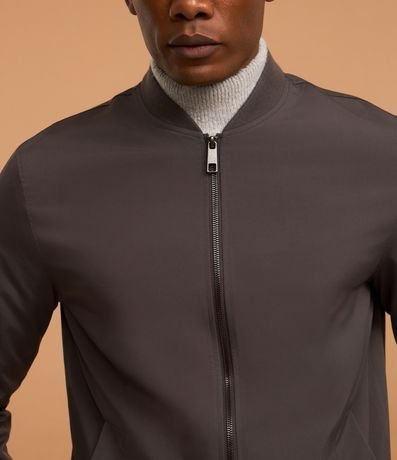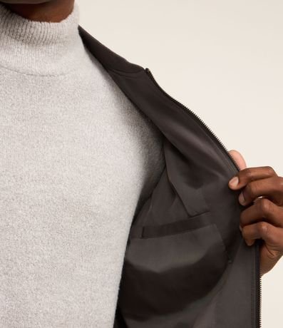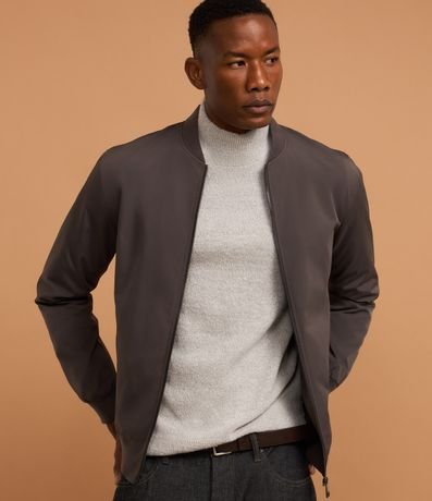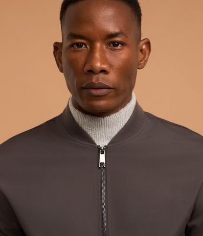 Ref: Jaqueta masculina em alfaiataria no modelo bomber, gola alta, zíper, bolsos laterais, manga e barra com ajustes.