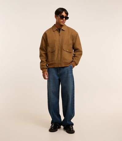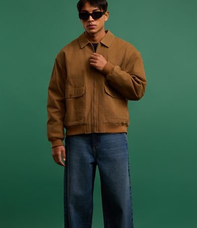 Jaqueta masculina confeccionada em sarja mais sustentável, no modelo bomber. Possui gola colarinho, manga longa, fechamento em zíper, bolso cargo com abotoamento e barras ajustadas.