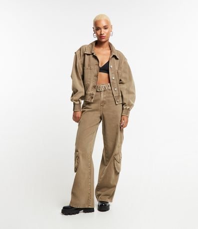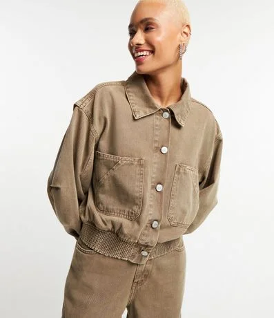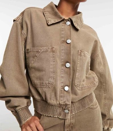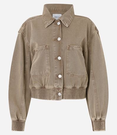 Jaqueta bomber confeccionada em sarja com colarinho na gola, botões frontais e bolsos grandes no peito. Possui elástico nos punhos e na barra.