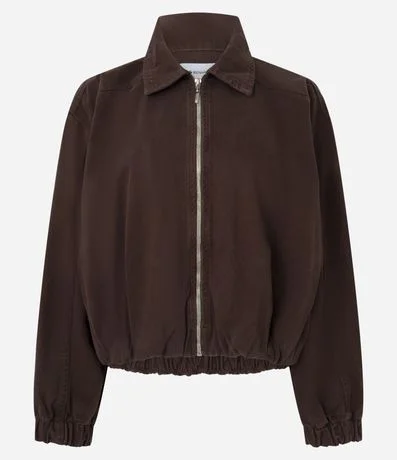 Jaqueta modelo bomber confeccionada em sarja de algodão certificado BCI, com estrutura encorpada e caimento moderno. Possui gola colarinho, fechamento frontal em zíper metálico, pregas na modelagem e punhos com elástico, garantindo visual urbano e versátil.