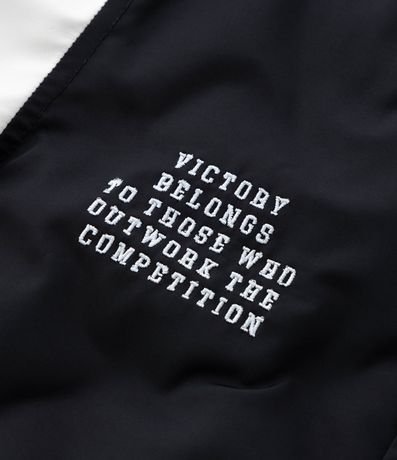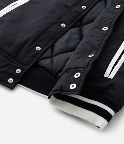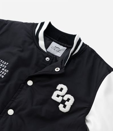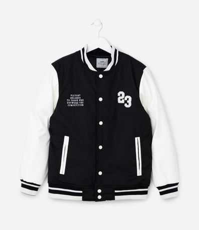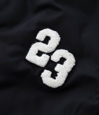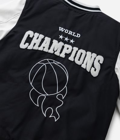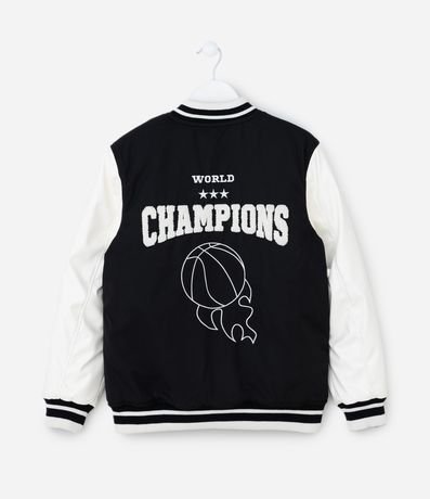 Ref: Jaqueta infantil confeccionada em material sintético, de modelinho bomber, com gola redonda, mangas longas contrastantes, bolsos e fechamento por botões. Possui bordado do número "23" no peito e nas costas de bola de basquete com lettering "Champions".