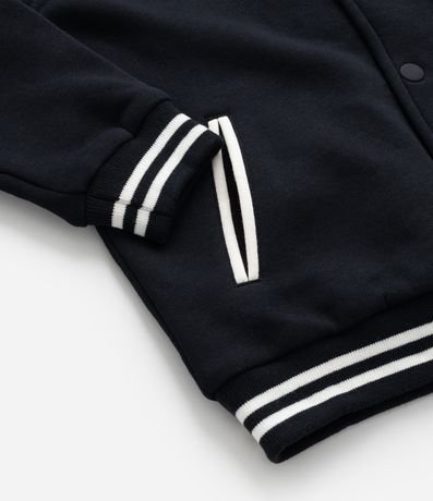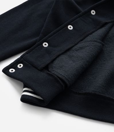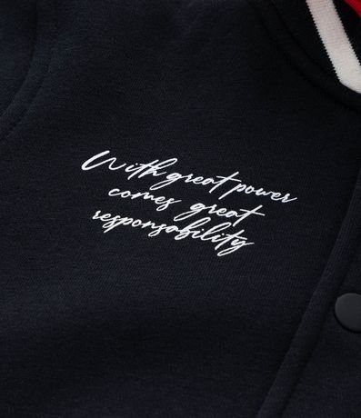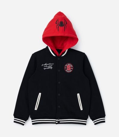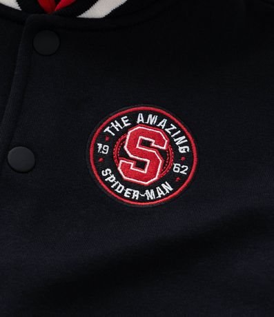 Jaqueta infantil de modelo bomber, gola com capuz, mangas longas, fechamento por botões e bolsos. Possui bordado do Homem-Aranha.