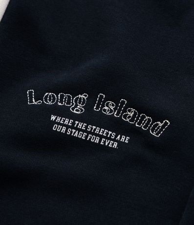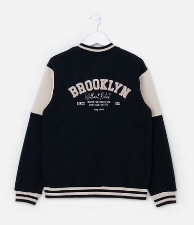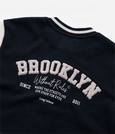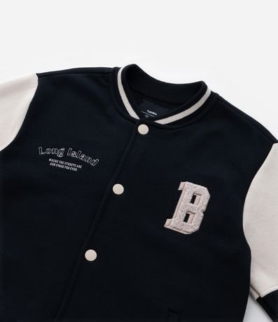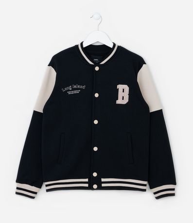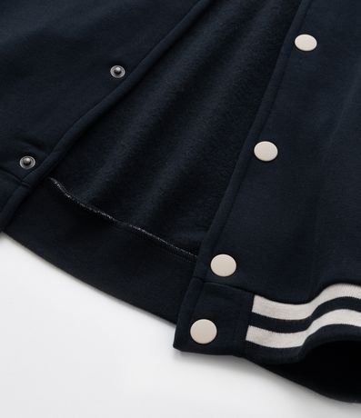 Ref: Jaqueta infantil modelo bomber, com golinha, manga e barra listradinha, fechamento por botões de pressão, recorte contrastante e bordado no peito e costas.