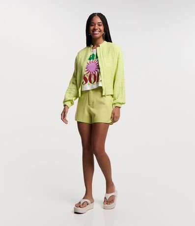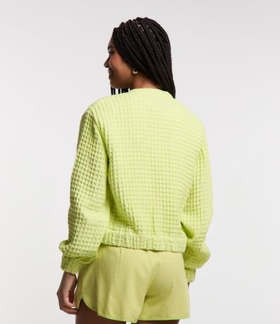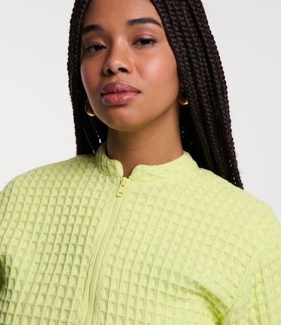 Ref: Jaqueta feminina maquinetada modelo bomber, com golinha alta, mangas longas, fechamento por zíper e textura.