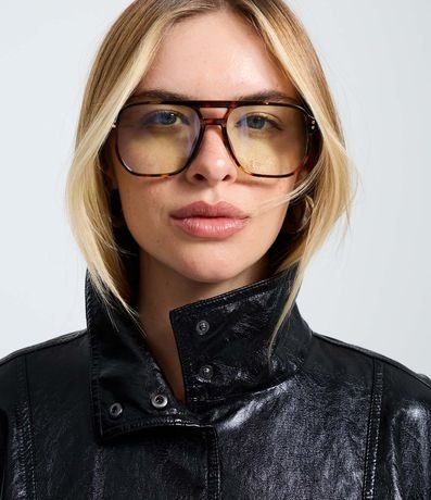 Jaqueta bomber pesada feminina confeccionada em PU. Possui gola alta estruturada e fechamento frontal, aba com botões de pressão, recortes marcados, punhos e barra ajustados e mangas longas