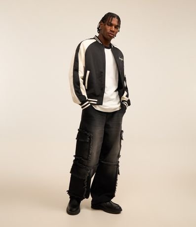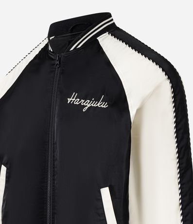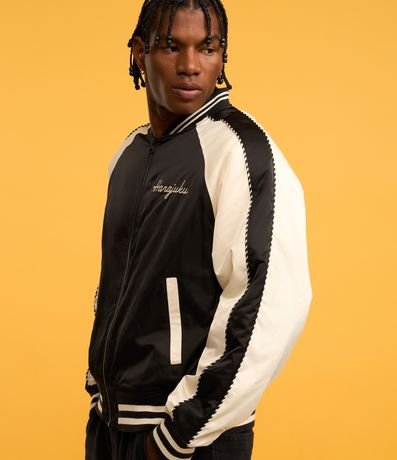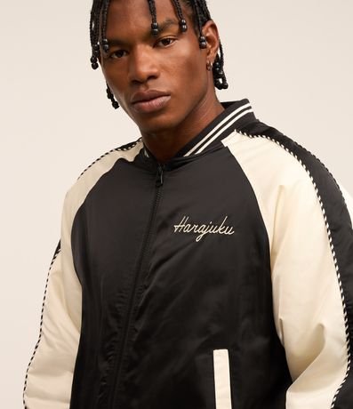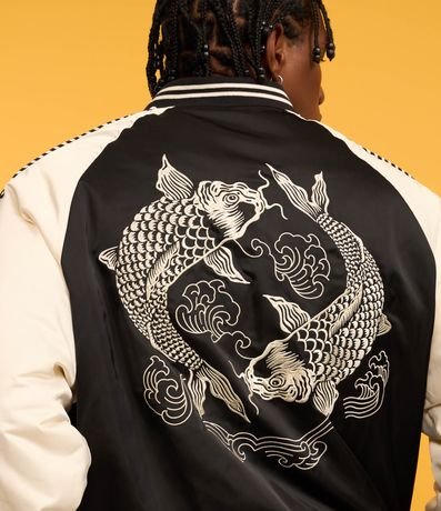 Jaqueta masculina no modelo boxy, possui gola com listras contrastantes, bordado "Harajuku" no peito, fechamento em zíper, manga longa, punhos e cintura ajustados com listras contrastantes, bolsos frontais, recortes contrastantes e bordado com estampa de carpas orientais nas costas.