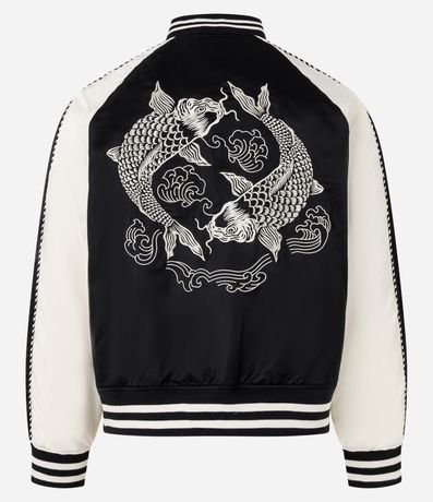 Jaqueta Boxy com Detalhes Contrastantes e Bordados de Carpas Orientais
