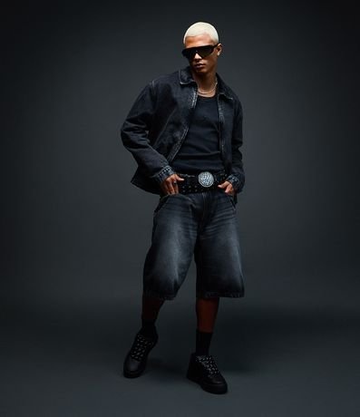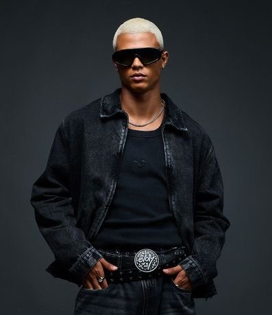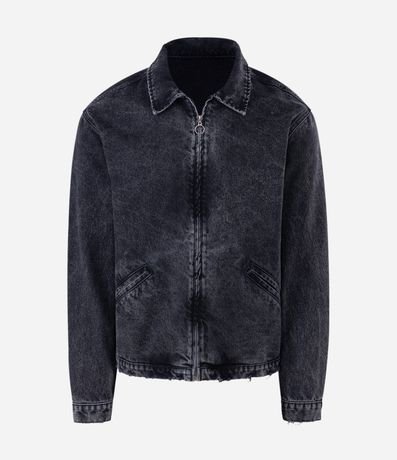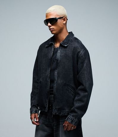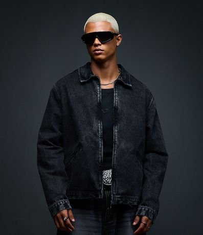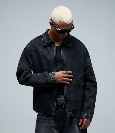 Jaqueta em jeans com visual desgastado e modelagem boxy, oferecendo estilo moderno e urbano. Possui gola tradicional, fechamento por zíper e bolsos laterais funcionais. Peça inspirada pelo álbum Eu venci o mundo do artista Veigh, confeccionado em algodão de certificado BCI.