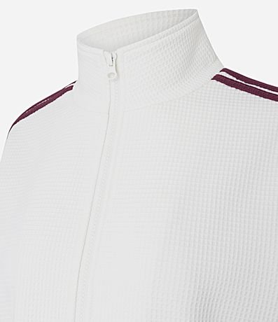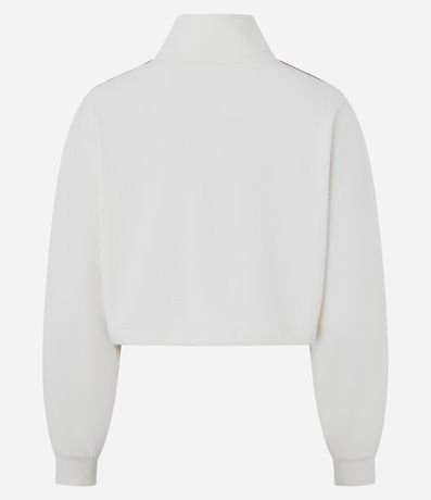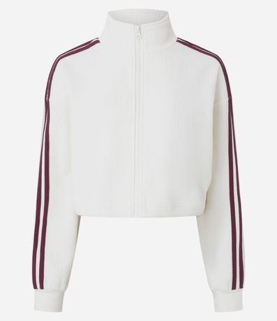 Jaqueta feminina de modelo boxy, confeccionada em moletom leve, com textura waffle e gola alta. Possui fechamento frontal por zíper, punhos ajustados e listras laterais contrastantes.