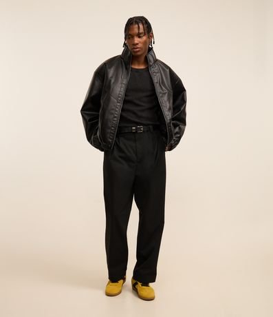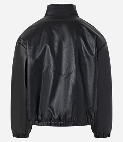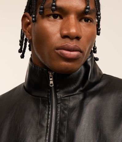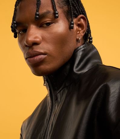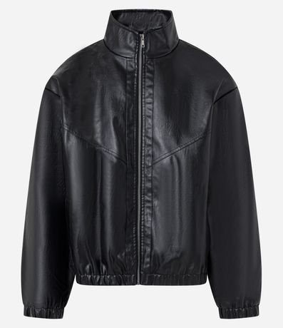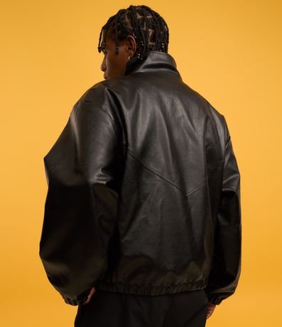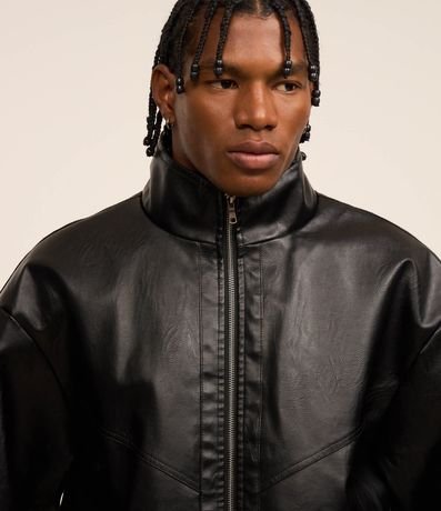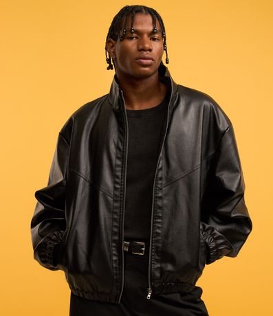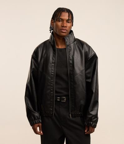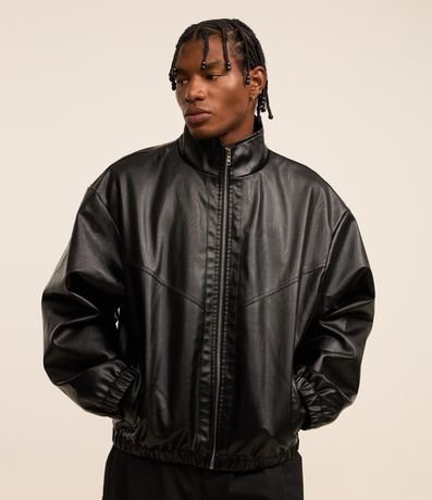 Ref: Jaqueta masculina confeccionada em material sintético, no modelo boxy, possui gola alta, manga longa, fechamento em zíper, recortes e barras ajustadas com elástico.