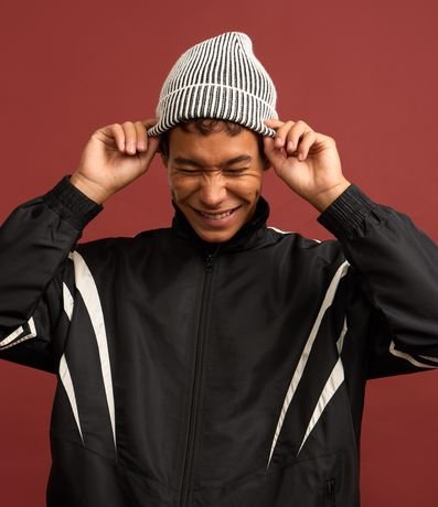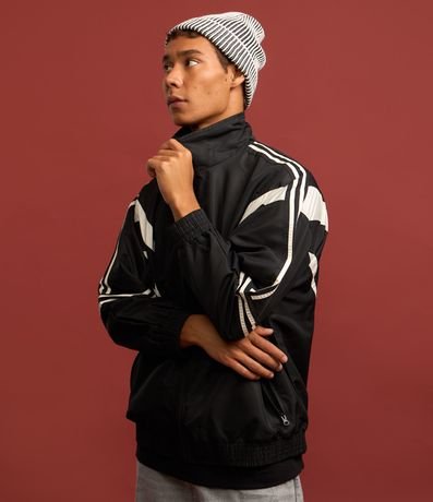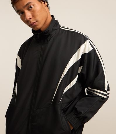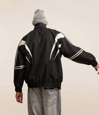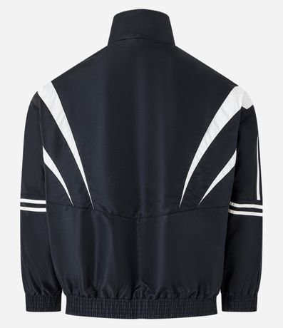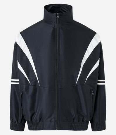 Jaqueta masculina confeccionada com maior tecnologia, gola alta, bolsos frontais, fechamento por zíper e mangas longas. Peça no modelo corta vento, com detalhes de recortes contrastantes, linhas nas mangas e elástico na cintura e pulsos.